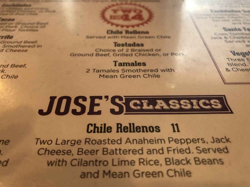 2 large roasted Anaheim peppers, Jack cheese, beer battered and fried. Served with cilantro lime rice, black beans and mean green chile.